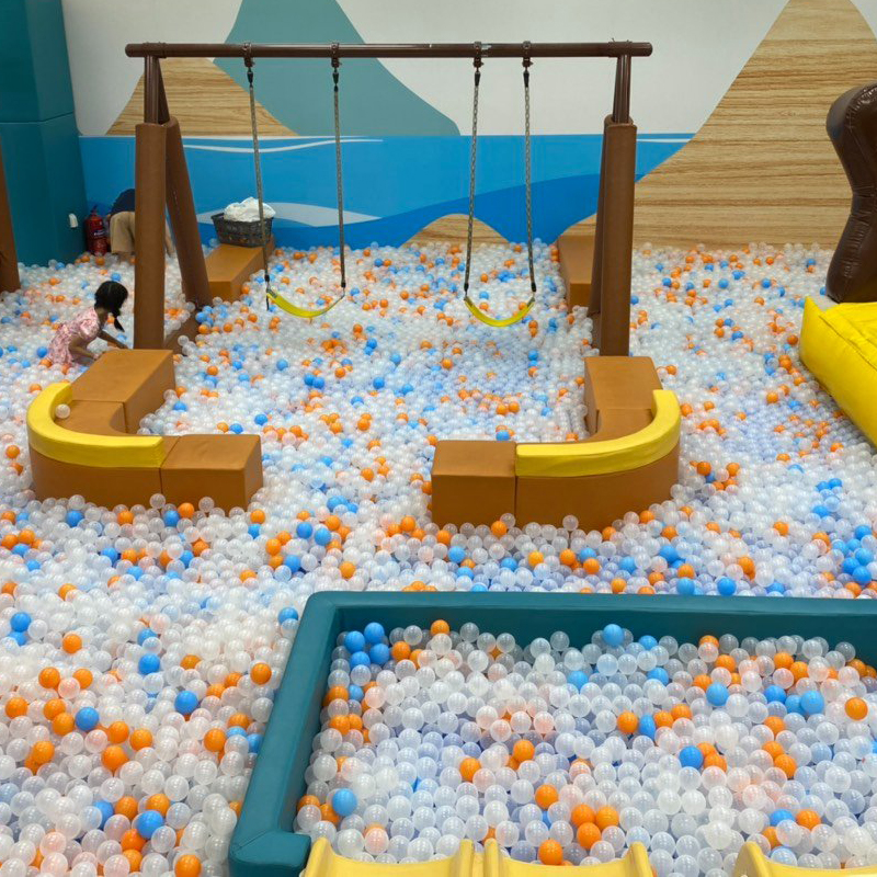 Tầng dưới khu vui chơi được bố trí: khu nhà bóng liên hoàn, sàn nhún. Trò chơi leo dốc đập chuông, hồ hạt, tô tượng, bàn chơi xe hot wheels,…